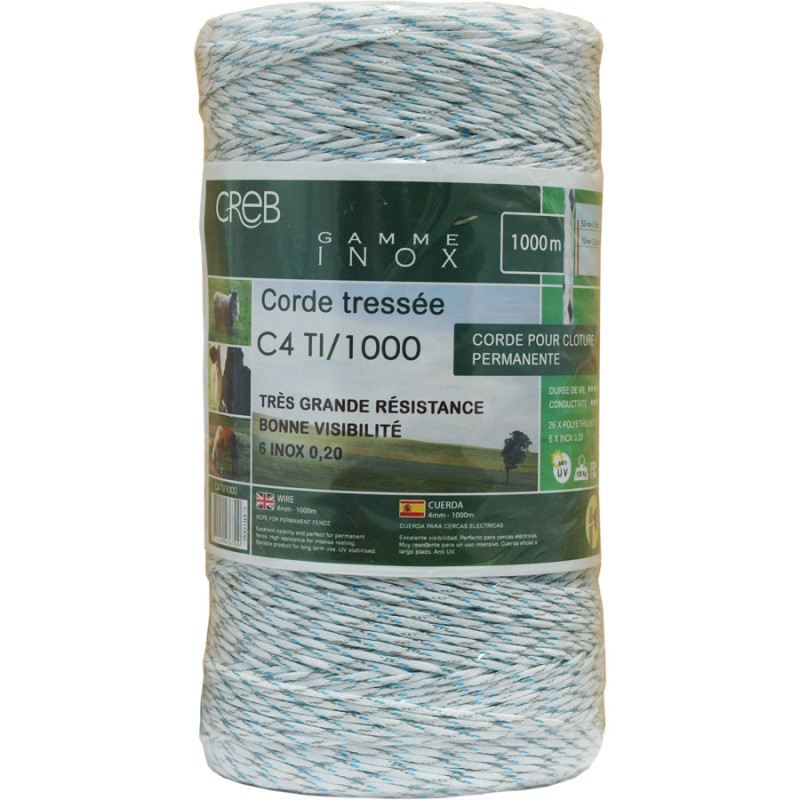 Σχοινί ηλεκτρικής περίφραξης με 6 αγωγούς από ανοξείδωτο ατσάλι πάχους 0.2mm τυλιγμένους σε γερό σχοινί πάχους 4mm.